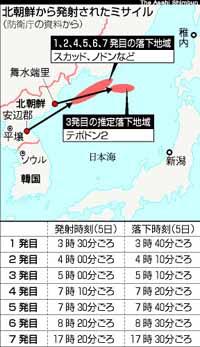 →防衛庁によれば、1,4,5発目=短距離用たるスカッド、2,6発目=中距離用たるノドン(5日23:03追記)