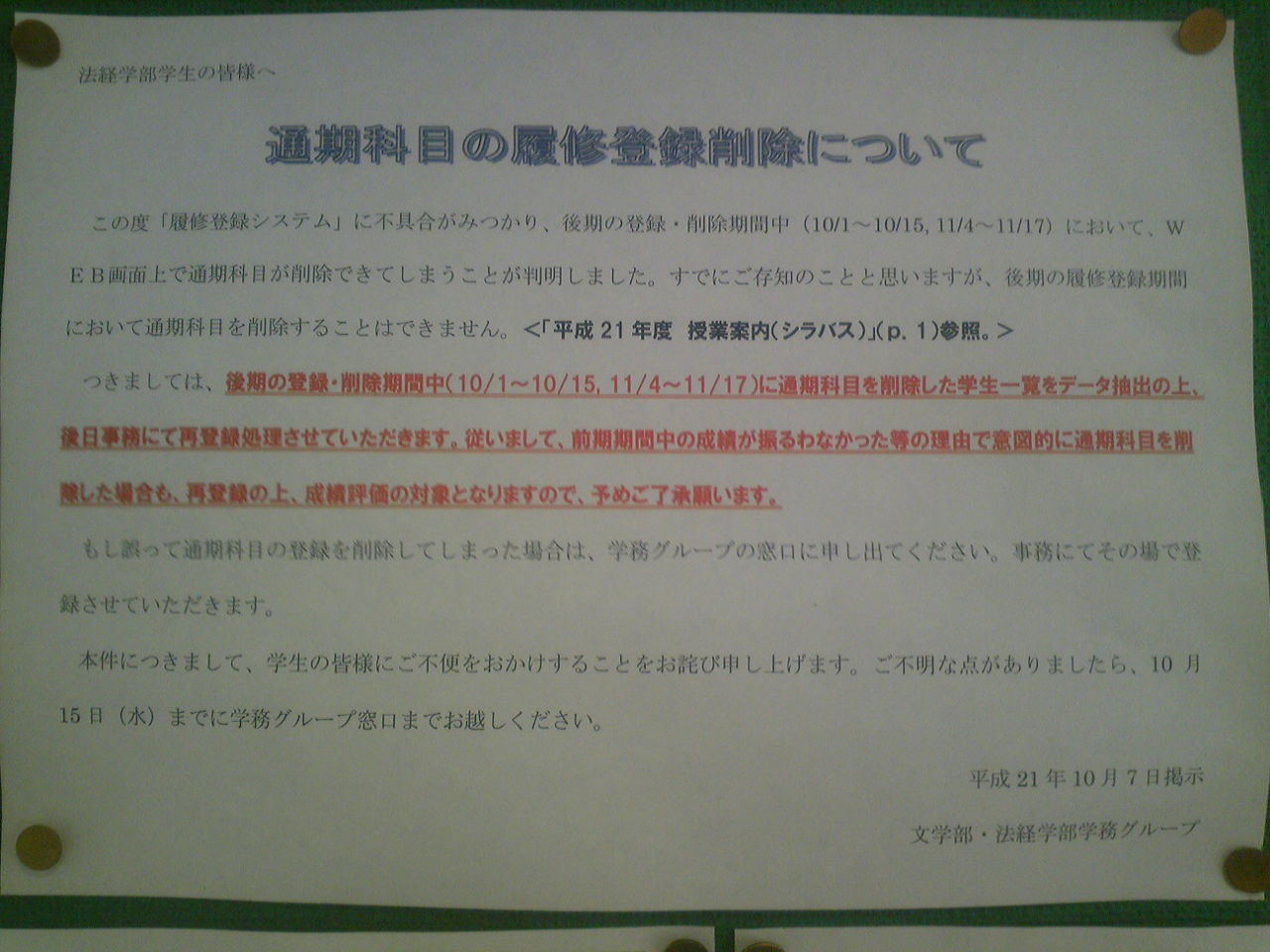 "後期の"履修取消期間に"通期の"履修を取り消せるバグが発見されてしまひましたね。